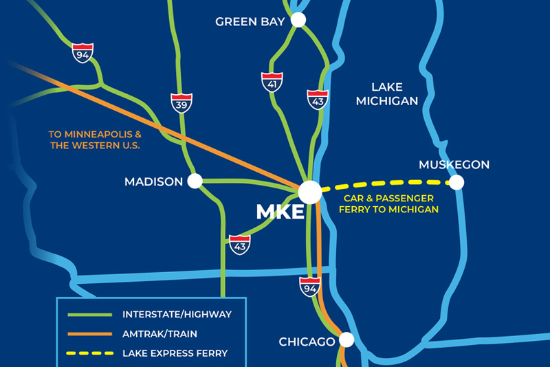 Milwaukee is a transportation hub for the Great Lakes Region. MKE Airport is conveniently located near several interstate highways, and is one of several U.S. airports that has an Amtrak station on site. MKE Airport is just a few miles from the Port of Milwaukee, making it easy for air passengers to arrive and depart from their Great Lakes cruise ships, or to catch the Lake Express car and passenger ferry across the lake to Michigan. Your passengers can easily explore the entire Great Lakes region from MKE!